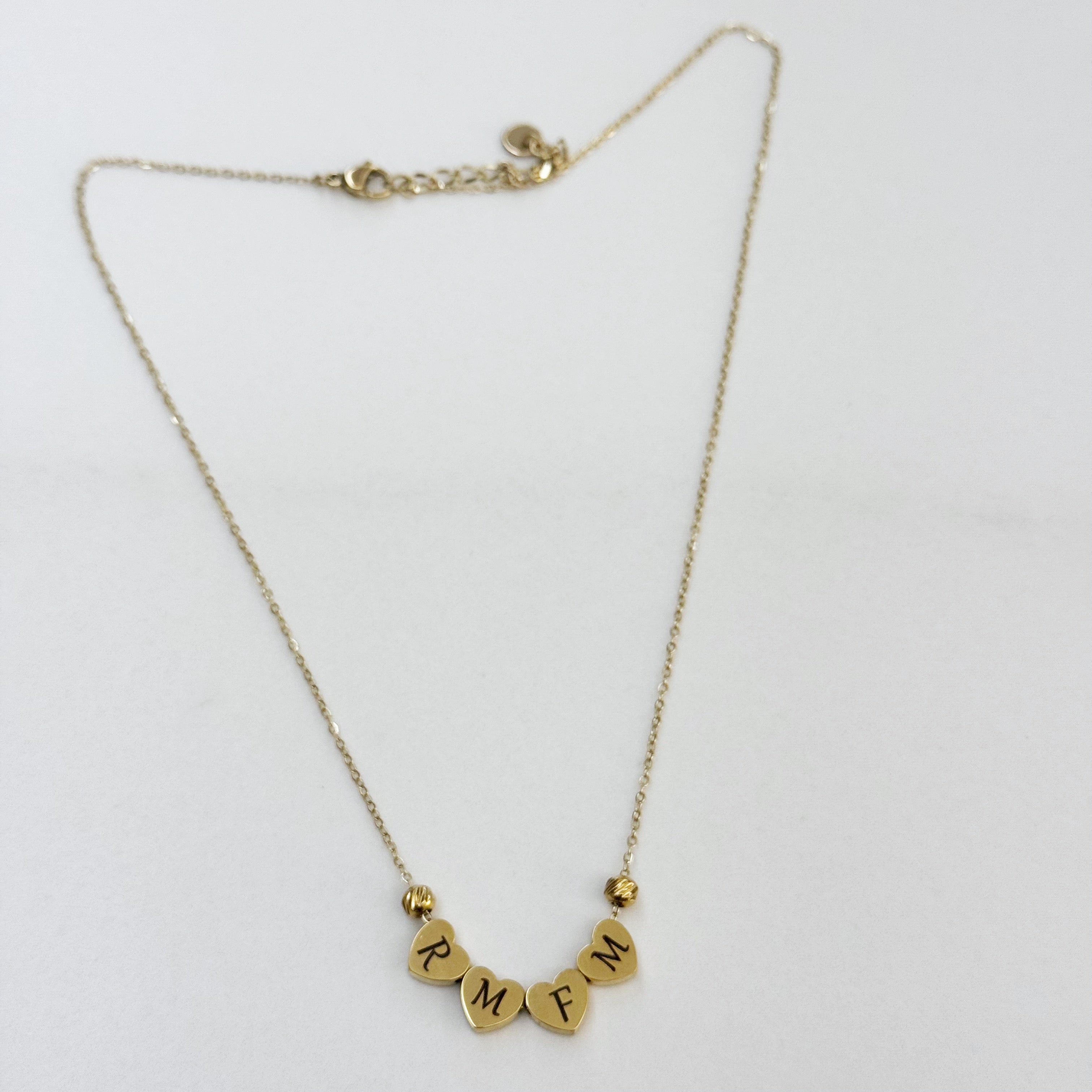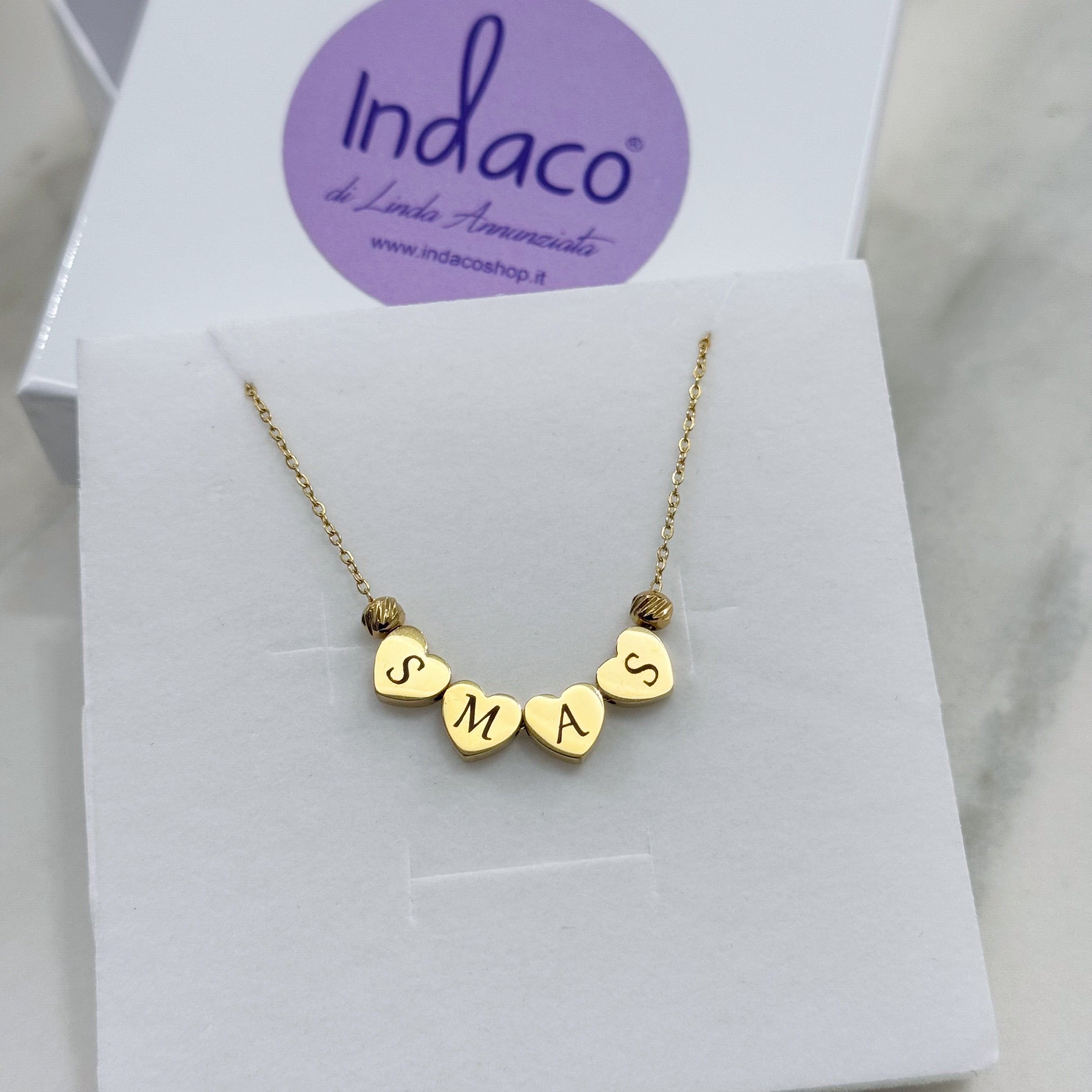 In acciaio.Personalizzabile sia con nomi (incisione piccola) o lettere come in foto. Lunghezza 45cm + regolazione.Grandezza cuori 1cm.